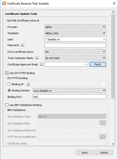 Bước 5: Chuyển tới Tab Windows Server Certificate Renewal để khai báo các Task cho Agent