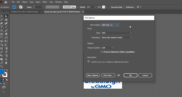 4.Sau khi lưu và mở tệp, bạn sẽ thấy các tùy chọn SVG trong một menu thả xuống. Chọn SVG Tiny 1.2 và nhấp vào OK .