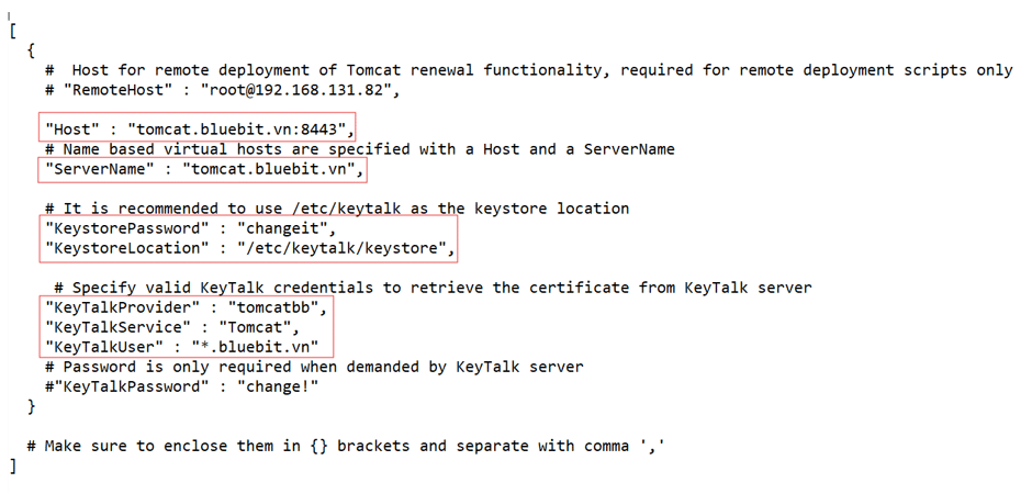 • “KeytalkUser”: “*.bluebit.vn” :Điền tên Server Name của bạn, tên miền mà bạn đang cấu hình SSL ( Nếu sử dụng Wildcard cho SSL hãy điền: *.domain.vn)