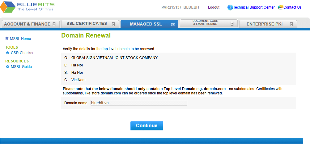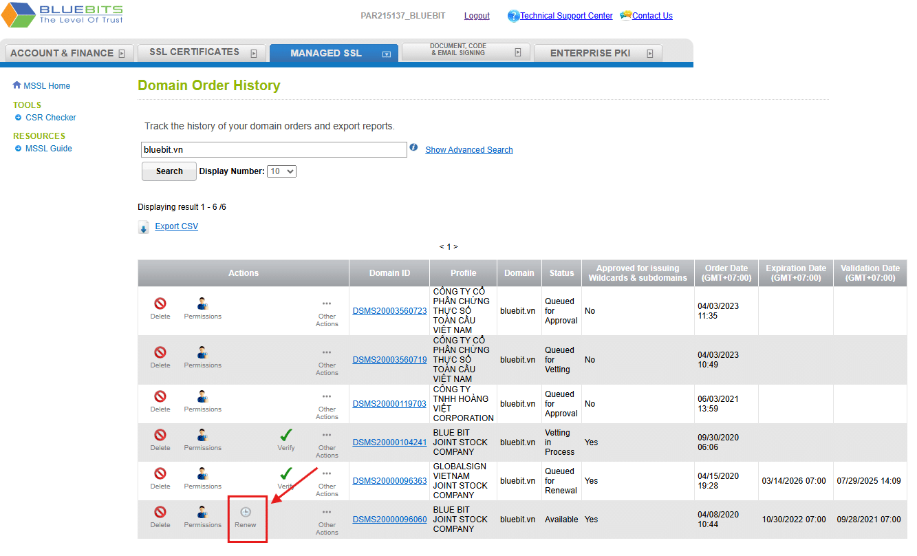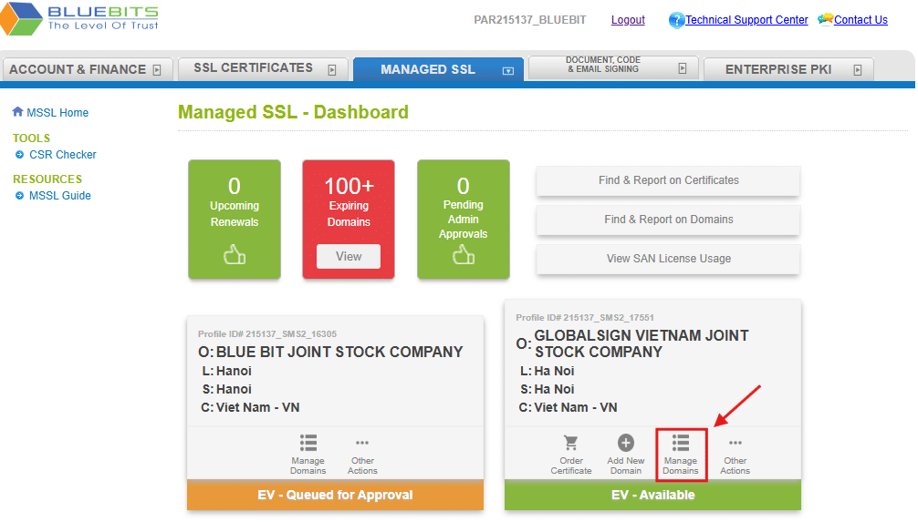 Bước 6: Quay về trang MSSL Home, lựa chọn menu Manage Domains