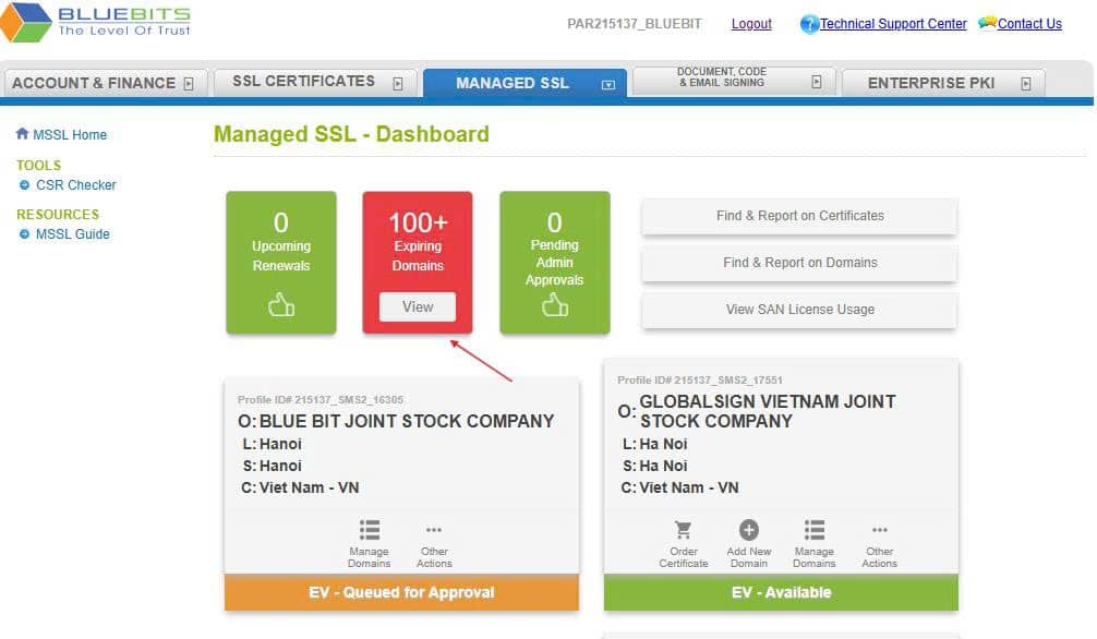Bước 1: Đăng nhập vào tài khoản GCC, chọn tab Managed SSL và bấm chọn View Expiring Domains